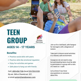Once a month from 5:30-7:30 pm at Lansdowne. Laid back, safe hangout for teenagers with a diagnosis of Autism. Enjoy a realxed, supervised environment. Caregivers do not need to stay but teen must be able to participate in a group with a ratio of 3 teens to 1 staff.